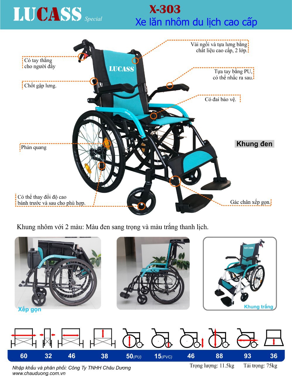 Khung bằng nhôm, vải cao cấp, phần tựa tay và tựa chân cố định, bánh trước và sau đặc, có thắng tay, gập lưng.